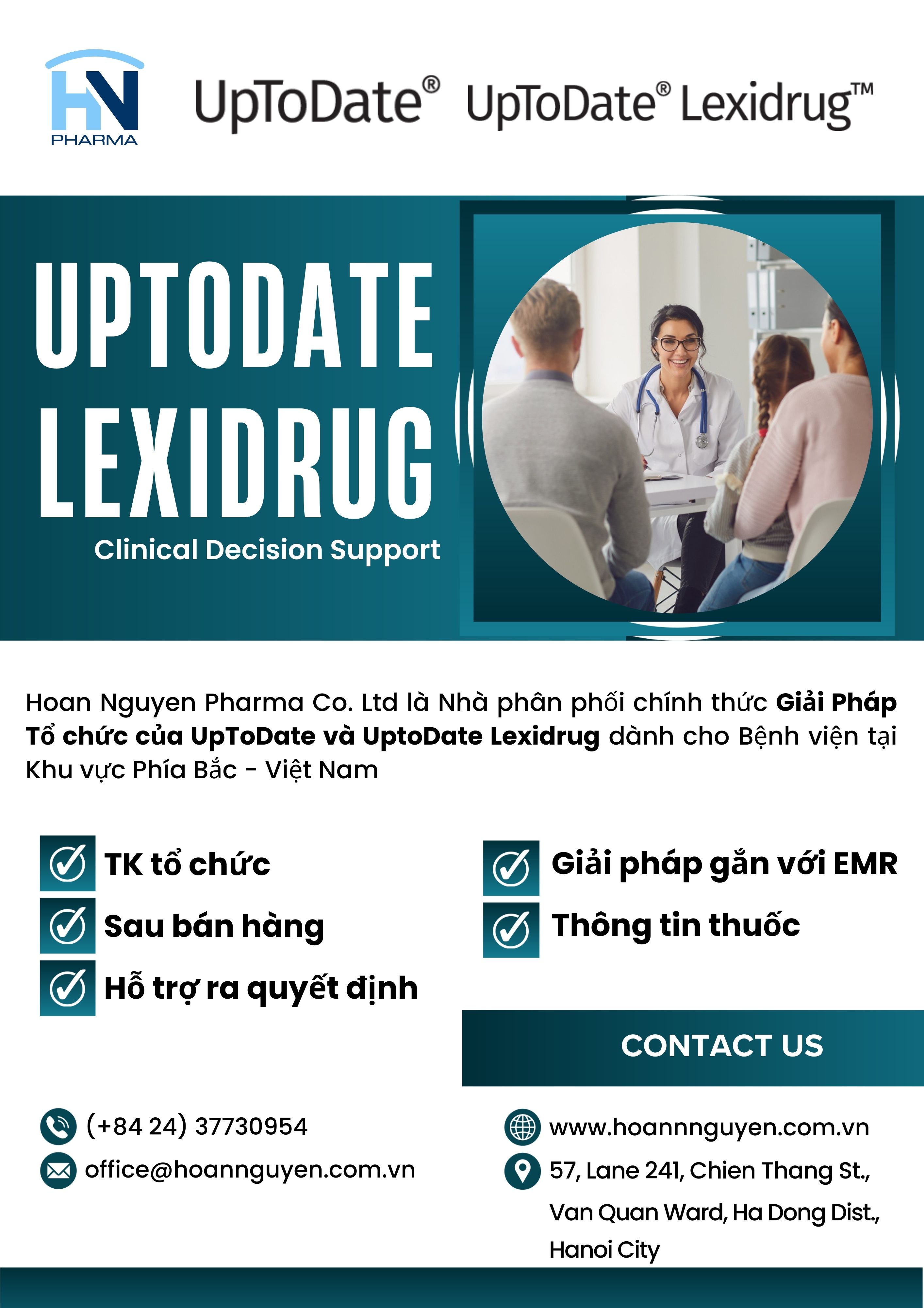 Công ty TNHH Dược phẩm Hoàn Nguyên trân trọng thông báo: Kể từ 01/01/2025, chúng tôi chính thức trở thành nhà phân phối Giải Pháp Tổ Chức của UpToDate và UpToDate Lexidrug dành cho các Bệnh viện tại khu vực Phía Bắc - Việt Nam.